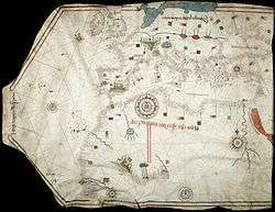 It is important to note that not all of the information on charts and maps were limited to the seas and oceans, or even the coastlines for that matter. That was primarily the case, but there were exceptions. There were copies of maps that did include information about land areas past the coast, though they were usually reserved for library use. An example of a map that did include land information, as well as trade information that surpassed what was typically on a map, was the Catalan Atlas, which was dated 1375.[12] When the Portuguese explored coasts, for example the coast of West Africa, cartographers and navigators would carefully record progress. They were sure to include the names of the places they encountered, as well as doing their best to draw the coast. Unlike Spain, however, despite the fact that there was supposedly a policy of secrecy attached to these records, it was quite often that as soon as data from the voyages was obtained, it was almost instantly recorded for public use and knowledge. Specifically, cartographers began to include actual definition in the territorial land. Cities, rivers, and mountain ranges all began to show up on some maps, whereas others still just included the bare minimum of the outline of the coast. Building from that, maps began to take on an ornamental value. No longer were the purposes just restrained to the seeking of political and economic knowledge, but they became decorative.[2] Building upon the evolution of cartography, the Portuguese went from simply incorporating the waters they traveled to incorporating land masses such as cities, mountains, and rivers. The Portuguese expanded map-making even further by the introduction of the representation of wind systems in the making of their maps.