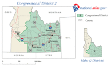 Idaho's 2nd congressional district is one of two congressional districts in the U.S. state of Idaho, in the eastern portion of the state. Beginning with the 2012 election, the district expanded westward and now includes most of Boise, the state capital and largest city.[1]