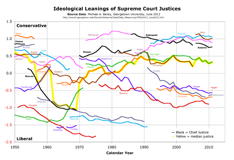 The graph below shows the ideological leaning of each justice by calendar year from 1950 to 2011.[21] The scale and zero point roughly correspond to DW-Nominate Common Space scores, but otherwise are arbitrary. As in the graph above, each unique color represents a particular Supreme Court seat. The black lines represent the leanings of the Chief Justices. The yellow line represents the median justice.