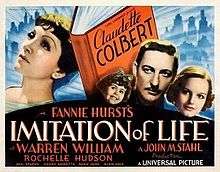 Imitation of Life is a 1934 American drama film directed by John M. Stahl. The screenplay by William Hurlbut, based on Fannie Hurst's 1933 novel of the same name, was augmented by eight additional uncredited writers, including Preston Sturges and Finley Peter Dunne.[1] The film stars Claudette Colbert, Warren William and Rochelle Hudson and features Louise Beavers and Fredi Washington.