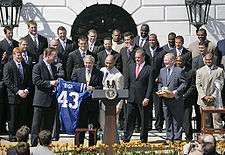 Then-U.S. President George W. Bush congratulates the Colts on their Super Bowl XLI victory.