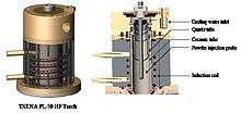 - confinement tube This tube serves to confine the plasma. Quartz tube is the common implementation. The tube is often cooled either by compressed air (<10 kW) or cooling water. While the transparency of quartz tube is demanded in many laboratory applications (such as spectrum diagnostic), its relatively poor mechanical and thermal properties pose a risk to other parts (e.g., o-ring seals) that may be damaged under the intense radiation of high-temperature plasma. These constraints limit the use of quartz tubes to low power torches only (<30 kW). For industrial, high power plasma applications (30~250 kW), tubes made of ceramic materials are typically used.[3] The ideal candidate material will possess good thermal conductivity and excellent thermal shock resistance. For the time being, silicon nitride (Si3N4) is the first choice. Torches of even greater power employ a metal wall cage for the plasma confinement tube, with engineering tradeoffs of lower power coupling efficiencies and increased risk of chemical interactions with the plasma gases.