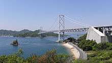 The Innoshima Bridge (因島大橋 Innoshima Ō-hashi) is a Japanese suspension bridge, part of the 59 kilometer Nishiseto Expressway linking the islands of Honshu and Shikoku. Completed in 1983, it has a main span of 770 metres (2,526 ft) and connects Mukaishima, Hiroshima with Innoshima, Hiroshima.