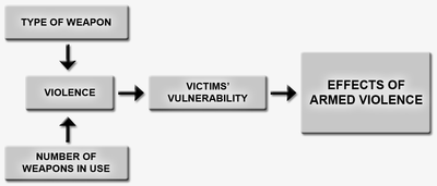 The model is constructed around four “risk factors” or determinants for any given effects of armed violence. The four determinants are the nature of the weapon, the number of weapons used (or potentially used), the way the weapon is used (the psychological aspect of the violence), and the victims’ vulnerability. An example is the lethality of attacks with firearms. This will be determined by: