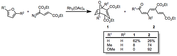 Furans react similarly with vinyl diazoacetates, although the intermediate cyclopropane may transform either into the Cope rearrangement product or an opened unsaturated carbonyl compound. The distribution of these products is highly dependent on the substitution pattern of the furan.[22]