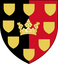 Arms: Per pale Gules and Sable, an antique coronet within eight escutcheons in orle Or.