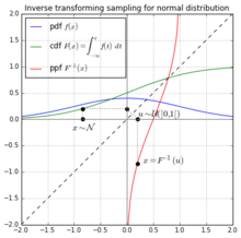 Computationally, this method involves computing the quantile function of the distribution — in other words, computing the cumulative distribution function (CDF) of the distribution (which maps a number in the domain to a probability between 0 and 1) and then inverting that function. This is the source of the term "inverse" or "inversion" in most of the names for this method. Note that for a discrete distribution, computing the CDF is not in general too difficult: we simply add up the individual probabilities for the various points of the distribution. For a continuous distribution, however, we need to integrate the probability density function (PDF) of the distribution, which is impossible to do analytically for most distributions (including the normal distribution). As a result, this method may be computationally inefficient for many distributions and other methods are preferred; however, it is a useful method for building more generally applicable samplers such as those based on rejection sampling.