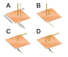 The inverted-F antenna is an evolution of the basic quarter-wave monopole antenna. The wire F-type antenna was invented in the 1940s.[1] In this antenna the feed is connected to an intermediate point along the length of the antenna instead of to the base. The base is connected to ground. The advantage of doing this is that the input impedance of the antenna is dependent on the distance of the feed point from the grounded end. The portion of the antenna between the feedpoint and the ground plane is essentially behaving as a short-circuit stub. Thus, the designer can match the antenna to the system impedance by setting the position of the feed point (RF systems commonly have a system impedance of 50 Ω whereas a λ/4 monopole has an impedance of 36.5 Ω).[2]