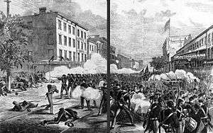 However, conscription was resisted by many Irish Catholics as an imposition.[40][41] When the conscription law was passed in 1863, major draft riots erupted in New York. It coincided with the efforts of the city's dominant political machine, Tammany Hall, to enroll Irish immigrants as citizens so they could vote in local elections. Many such immigrants suddenly discovered they were now expected to fight for their new country. The Irish, employed primarily as laborers, were usually unable to afford the $300 as a "commutation fee" to procure a replacement for service, while more established New Yorkers receiving better pay were able to hire substitutes and avoid the draft.[42] Many of the recent immigrants viewed freed slaves as competition for scarce jobs, and as the reason why the Civil War was being fought.[43] African Americans who fell into the mob's hands were often beaten, tortured, or killed, including one man, William Jones, who was attacked by a crowd of 400 with clubs and paving stones, then hung from a tree and set alight.[44][45] The Colored Orphan Asylum on Fifth Avenue, which provided shelter for hundreds of children, was attacked by a mob, although the largely Irish-American police force was able to secure the orphanage for enough time to allow orphans to escape.[44][46]