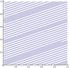 One way of constructing a torus is as the quotient space of a two-dimensional real vector space by the additive subgroup of integer vectors, with the corresponding projection . Each point in the torus has as its preimage one of the translates of the square lattice in , and factors through a map that takes any point in the plane to a point in the unit square given by the fractional parts of the original point's Cartesian coordinates. Now consider a line in given by the equation y = kx. If the slope k of the line is rational, then it can be represented by a fraction and a corresponding lattice point of . It can be shown that then the projection of this line is a simple closed curve on a torus. If, however, k is irrational, then it will not cross any lattice points except 0, which means that its projection on the torus will not be a closed curve, and the restriction of on this line is injective. Moreover, it can be shown that the image of this restricted projection as a subspace, called the irrational winding of a torus, is dense in the torus.