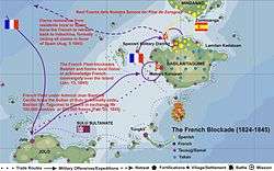 In 1843, the French Foreign Minister François Guizot sent a fleet to Vietnam under Admiral Cécille and Captain Charner,[6] which started the French intervention in Vietnam. The move responded to the successes of the British in China in 1842, and France hoped to counterbalance these successes by accessing China from the south. The pretext however was to support British efforts in China, and to fight the persecution of French missionaries in Vietnam.[7] The fleet, accompanied by the diplomat Lagrene, tried to seize the island of Basilan in order to create a base similar to Hong Kong, but projects had to be abandoned following the strong opposition of Spain claiming the island was part of the Philippines.[8]