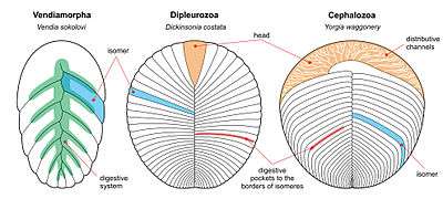 The dipleurozoan body is subradial divided by isomers entirely (e.g., Dickinsonia and Phyllozoon). Juveniles Dickinsonia show an undivided anterior area but this region was reduced in the course of ontogeny, and in adult Dickinsonia-like proarticulates changed so strongly that became almost indistinguishable from isomers.[4][5][8]