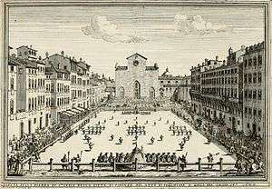 Other forms of football were played in Italy in ancient times, the earliest of which was Harpastum, played during the times of the Roman Empire.[4] This game may have also been influential to other forms throughout Europe due to the expansion of the Empire, including Medieval football. From the 16th century onwards, Calcio Fiorentino, another code of football distinct from the modern game, was played in the Piazza Santa Croce in Florence. Some famous Florentines were amongst players of the game, particularly the Medici family including Piero, Lorenzo and Alessandro de' Medici.[5] As well as Popes such as Clement VII, Leo XI and Urban VIII[5] who played the game in the Vatican. The name calcio ("kick") was later adopted for football in Italy.