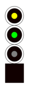 Line clear. Proceed at 30 km/h and prepare to stop. Line blocked and abnormally close (less than 600/900m but not less than 350m) or track is somehow obstructed. In the latter case, the next signal will show the aspect "red and double yellow."