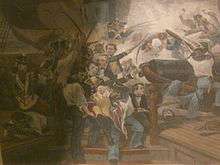 James Lawrence (October 1, 1781 – June 4, 1813) was an American naval officer. During the War of 1812, he commanded USS Chesapeake in a single-ship action against HMS Shannon commanded by Philip Broke. He is probably best known today for his last words or "dying command" "Don't give up the ship!", which is still a popular naval battle cry, and which was invoked by Oliver Hazard Perry's personal battle flag, adopted to commemorate his dead friend.[1][2]