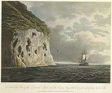 Maurice led a party of men onto the rock on 7 January 1804 and work immediately began on fortifying the small cove they had landed at with their launch's 24 pounder, and establishing forges and artificers' workshops in a cave at the base of the rock.[5] After fixing ladders and ropes to scale the sheer sides of the rock, they were able to access the summit and began to establish messes and sleeping areas in a number of small caves.[6] Bats were driven out by burning bales of hay, and a space was cleared by blasting at the top of the rock in order to establish a battery.[6]