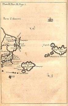 Japan is shown on the map at the beginning of part III,[1] which also shows the island of "Yesso" (i.e. Hokkaido), "Stats island" (Iturup) and "Companys Land" (Urup) to the north. The map also marks the Vries Strait and Cape Patience, though this is shown on the northeast coast of Yesso, rather than as part of Sakhalin, which was little known in Swift’s time. On the island of Japan itself the map shows "Nivato" (Nagato), Yedo, "Meaco" (Kyoto), Inaba and "Osacca" (Osaka)