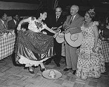 As the dance has lost its controversial status and gained status as a representative of Mexico, the dancers have come to wear garb that is also highly representative of Mexican women and men.[4] For women, the most traditional outfit is called the "China Poblana."[2] The blouse and skirt combination is named after a woman from India who came to Mexico on the Manila Galleon to work as a servant in the early 19th century. Her Asian dress was copied and then adapted in the State of Puebla, with the skirt now heavily embroidered and otherwise decorated with patriotic images. The traditional outfit for men is that of the charro, generally heavily decorated in silver trim.[1][2]