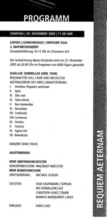Under the direction of Fabio Luisi, the commission of the Radio Suisse Romande Oyama for orchestra was presented by the Orchestre de la Suisse Romande in 2000.[3] It was live broadcast in the western Swiss television. Later performances followed in Weimar and Leipzig Gewandhaus with the MDR Symphony Orchestra under Fabio Luisi. There were broadcasts in France Musique. The piece was presented to the International Rostrum of Composers of the UNESCO in Paris.