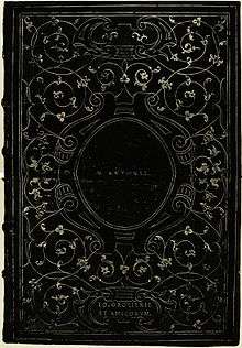 Grolier was particularly interested in the Latin classics, and his books were bound in different coloured leather according to subject matter. His first period in Italy already shows him taking an innovative interest in bookbinding, commissioning a series of "plaquette bindings" with large medal-like reliefs at the centre of the cover. Previously this style had only been used for special presentation volumes, and Grolier was the first collector to apply it systematically to books for his own library, which he seems to have begun to do in 1510.[12] Most of his library was bound in France, but the designs continued to show Italian influence. Grolier gave his name to a style of bookbinding ornamented with geometric patterns, exemplified in those he commissioned, and perhaps helped to design.[13] Grolier bindings were mostly produced in Paris between 1520 and 1555, and show a development in style: "Simple geometrical strapwork designs with fleurons at the corners of the central panel developed in the later bindings into elaborate curvilinear interlacings combined with arabesques sometimes enclosed in roll-produced borders".[14]