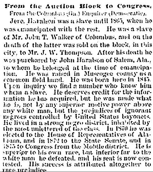 Jeremiah Haralson (April 1, 1846 – 1916), was among the first ten African-American Congressmen in the United States. Born in slavery in Columbus, Georgia, Haralson eventually rose to serve in the United States House of Representatives from Alabama's 1st congressional district in the 44th United States Congress. He had previously been elected to the state house and state senate. He also received appointments to Republican patronage positions.