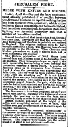 2. Freitag, Ulrike; Fuccaro, Nelida; Ghrawi, Claudia; Lafi, Nora (30 March 2015). Urban Violence in the Middle East: Changing Cityscapes in the Transition from Empire to Nation State. Berghahn Books. p. 188. ISBN 978-1-78238-584-4. While the first half of the procession was passing through the Jaffa Gate, the riot began between Christaki's pharmacy and the Credit Lyonnais. Available sources do not clarify the exact trigger, and it is arguable that more than one event functioned as a catalyst. In the vicinity of the Arab rally, some Zionists were listening to the speeches. It is likely some belonged to the self-defence force organized by Vladimir Jabotinsky, by this time already enlisting six hundred troops performing military drills on a daily basis." Already in early March, Jabotinsky was working to inflame the atmosphere, and he began to publicly predict a pogrom. Some evidence suggests that these Jewish spectators were quite provocative. Allegedly, a Jew pushed an Arab carrying a nationalist flag, and he tried to spit on the banner and on the Arab crowd. According to testimony gathered by the French consul, some young Jews standing near Jaffa Gate attacked some Arabs after the speech delivered by Muhammad Darwish of the Arab Club (one of the Christian-Muslim associations). All of these reports suggest only Jewish provocation; however, it is possible, though unreported, that Arab activities also triggered the riots.