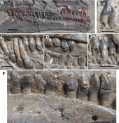Jianchangosaurus possesses 27 maxillary teeth and approximately 25 to 28 dentary teeth.[Note 2] The crowns on its teeth diminish in size as they progress toward the posterior of the skull. The teeth on the upper jaw, exhibit the conventional dental morphology - in which the surface of the tooth facing the outside of the mouth is convex. The teeth on the lower jaw possess the reversed morphology, where the surface of the tooth facing the outside is concave. Pu et al. (2013) noted that this dental morphology "likely maximized the biting stress during occlusion to cut fibers of plant material, similar to ornithopods and ceratopsians".