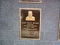 In a 1969 poll by the Baseball Writers' Association of America to commemorate the sport's professional centennial, McCarthy finished third in voting for the greatest manager in history, behind John McGraw and Casey Stengel. In a similar BBWAA poll in 1997 to select an All-Century team, he finished second behind Stengel.[11] On April 29, 1976, the Yankees dedicated a plaque for their Monument Park to McCarthy. The plaque calls him "One of baseball's most beloved and respected leaders."[12] In honor of his commitment to Buffalo, McCarthy became a charter member of the Buffalo Baseball Hall of Fame in 1985.[13]