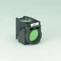 Around 1962 Ploem started work in collaboration with Schott on the development of dichroic beam splitters for reflection of blue and green light for fluorescence microscopy using epi illumination. At the time of his first publication [2] on fluorescence microscopy using epi illumination with narrow-band blue and green light, he was not aware of the development of a dichroic beam splitter for UV excitation with incident light by Brumberg and Krylova [1]. Neither was the Leitz company, Soon it became clear that excitation with narrow-band blue and green light opened optimal possibilities for the detection of the widely used immunofluorescence labels fluorescein isothiocyanate (FITC) and tetramethyl rhodamine isothiocyanate (TRITC) [3]. The use of blue and green excitation also minimized autofluorescence of tissue components an undesired effect encountered with conventional transmitted illumination with UV light. FITC could now be excited with narrow band blue light (using a band interference filter with a half width of 16 nm), close to the excitation maximum at 490 nm (long wavelength blue), with clear observation of the green fluorescence peak emission at 520 nm. Autofluorescence of tissue components was minimized (Fig. 2a, b) resulting in a high image contrast [4]. Excitation of FITC near its excitation maximum enabled such an efficient excitation that even a mercury high-pressure arc lamp, having no strong emission peak in the blue wavelength range, could be used [5]. Furthermore, epi-illumination with a green reflecting dichroic mirror enabled for the first time the excitation of Feulgen pararosaniline with the strong mercury emission line at 546 nm. In his second publication on the multi-wavelengths epi-illuminator [3], describing a Leitz prototype with four dichroic beam-splitters, Ploem could acknowledge the contribution of Brumberg and Krylova [1]. The inaccessibility of Russian research in that time period, and the absence of any major industrial development of epi-fluorescence microscopy in Russia or East Germany was the reason that Leitz and Zeiss had not been aware earlier of such a development. The possibility to introduce epi-illumination with UV light, although useful for several applications, had not been a motive for a new technological development at Leitz, since they had already excellent transmitted dark field UV excitation available. Subsequently Leitz developed a novel multi-wavelength fluorescence epi-illuminator (Leitz PLOEMOPAK) with four rotating dichroic beamsplitters for respectively UV, violet, blue and green light]. In successive generations of Leitz illuminators (containing four dichroic beamsplitters) barrier filters and a rotating turret for excitation filters were added [3,6.7]. Finally an elegant epi-illuminator was constructed by Kraft [8] containing multiple sets of a combination of an excitation filter, a dichroic beamsplitter and a barrier or emission filter, mounted together in a filter cube, also called filter block (Fig. 4). Since this illuminator permitted the filter cubes to be rapidly turned into the optical light path, multi-wavelength illumination of the same section of tissue became a practical proposition. Moreover, the four filter cubes in the illuminator could be exchanged by the user (Fig 1). Different sets of four filter cubes could be assembled, chosen from many filter cubes, containing combinations of excitation, barrier filters and dichroic beamsplitters, developed for different applications. The increasing worldwide use of routine immunofluorescence microscopy in medical diagnosis and molecular biology research could, however, profit from the new possibility @9 of epi-illumination permitting using narrow band excitation with blue and green light [9] . An important step for studies with live cells, was the design by Ploem of the first inverted fluorescence microscope with a multi wavelength epi illuminator under the microscope stage.. This provides free working stage above the microscope stage for eventual manipulation of the cells. . Following these suggestions by Ploem, Leitz also manufactured an inverted microscope with epi-illumination.