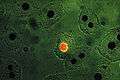 Fig. 3a: Liver tissue. Nuclei stained with Feulgen-pararosanilin for DNA, and visualized with transmitted green light. This stain was known as absorbing stain and not known to be fluorescent. One on the nuclei is illuminated with incident narrow-band green light (546 nm) resulting in a red fluorescence emission.