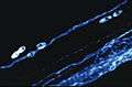 Fig. 6b: Same tissue and staining as Fig. 6a: Epi-illumination with narrow-band violet excitation light (LP 3mm GG 400 and SP(KP)425 interference filter), a dichroic beam splitter 495 nm, reflecting violet light and a barrier filter LP460nm. The filter cube permitted for the first time the observation of blue fluorescent adrenergic nerve fibers, distinctly different from yellow fluorescent mast cells (Ploem, 1971).