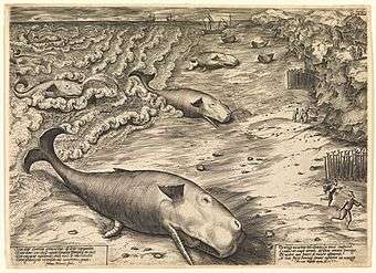 After marrying Elisabeth Bloemsteen in 1576 he soon left her and was recorded in Delft from 1577 to 1579. His famous engraving of beached whales on the beach of Ter Heyde was made by him in 1577. He also received commissions to produce small oval portraits of prominent citizens of Delft.[3] Upon returning to Antwerp in 1579, Johannes Wierix worked not only for Plantin, but also for other publishers such as Hans Liefrinck, Jan-Baptist Vrients, Phillip Galle, Gerard de Jode, Willem and Godevaard van Haecht and Hieronymous Cock's widow Volcxken Dierix who continued the publishing business after her husband's death.[3][4] In addition, he occasionally published his own engravings himself. Johannes Wierix was so much in demand that he could exact such a high price for his work that Plantin was not always able or willing to engage him for a publication project.[5]