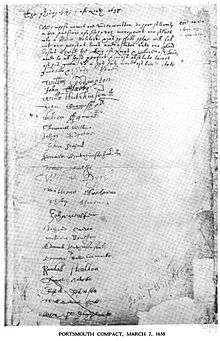On 7 March 1638, just as Anne Hutchinson's church trial was getting underway, a group of men, including John Clarke, gathered at the Boston home of William Coddington and drafted a compact for a new government. [16] It is probable that Clarke wrote the document, based on its religious sentiment.[17] Altogether, 23 individuals signed the instrument which was intended to form a "Bodie Politick" based on Christian principles, and Coddington was chosen as the leader of the group.[18] Roger Williams suggested two places that the exiles could settle: Sowams (later Barrington, Rhode Island), and Aquidneck Island, both locations being on or in the Narraganset Bay. Williams was uncertain about English claims to these lands, so Clarke led a delegation of three men to Plymouth where he was informed that Sowams was not only in use, but was considered so desirable that they called it the garden of the entire colony. However, the island was not claimed by the colony, and this suited Clarke whose desire for the exiles was to "get clear of all, and be ourselves".[19]