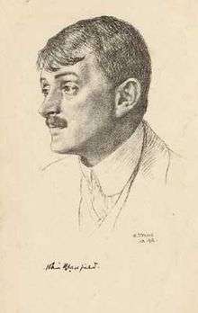 In addition to the commission for Queen Alexandra's Memorial Ode with music by Elgar, many of Masefield's short poems were set as art songs by British composers of the time.[13] Best known by far is John Ireland's "Sea Fever", the lasting popularity of which belies any mismatch between the urgency of the language and the slow, swung melody.[14] Frederick Keel crafted several songs drawn from the Salt-Water Ballads and elsewhere. Of these, "Trade Winds" was particularly popular in its day,[15] despite the tongue-twisting challenges the text presents to the singer.[16] Keel's defiant setting of "Tomorrow", written while interned at Ruhleben during World War I,[15] was frequently programmed at the BBC Proms after the war.[17] Another memorable wartime composition is Ivor Gurney's climactic declamation of "By a bierside", a setting quickly set down in 1916 during a brief spell behind the lines.[18]