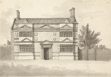 Grimm also records another building just to the north of the palace which he describes as Colonel Bromhead's House. This fronts onto the High Street. This is an interesting example of the Lincolnshire Artisan Mannerism style of house building of the mid-17th century. It was built of brick for Alderman Original Peart in 1646, and was one of the earliest examples of brick building in Lincoln. It passed from him to the Bromhead family.[7]