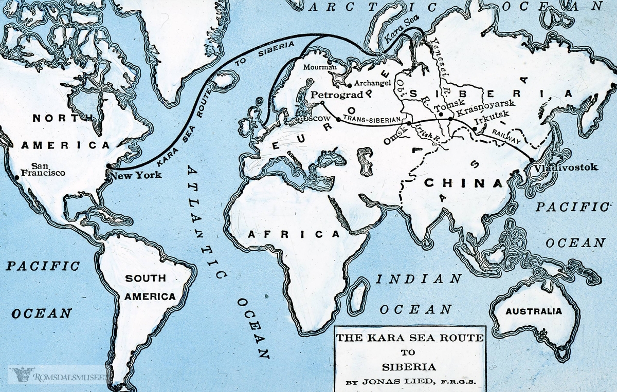 Lied's idea for a sea route to Yenisei came from the English businessman Alfred Derry and from Joseph Wiggins’ book on the Northeast passage. Lied terminated his employment with the Burroughs Adding Machine Company and in 1912 founded The Siberian Steamship, Manufacturing & Trading Company). The company’s main office was in Krasnoyarsk and eventually offices in St Petersburg (26 Nevsky Prospect across the street from Kazan Cathedral), London, New York, Moscow, Novosibirsk og Arkhangelsk.[4] The initial share capital was 142,000 NOK, and gradually expanded to 8 million in 1917. Lied’s plan was to transport goods through the great rivers of Siberia, and exchange goods to West European ocean vessels at these rivers' arctic mouth. From Krasnoyarks the Yenisei is 2500 km og there was at that time no roads or railways along the river. Because of ice this northern route could only be used July through September.[4][6]