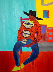Jonathan Mwe di Malila uses strong, vibrant and unbroken colours. Inspired by Fauvism and Pop-Art he aims to counteract the fugacity of impressionistic paintings to give the artwork more duration. Many of his paintings include african or congolese elements, combined with everyday objects, subjects and situation to create a funny content. His main Medium is oil, which he often combines with acrylics or typicall african fabrics, such as african wax prints. His art has no political intent, it just serves to uplift his heritage and bring his culture to people. Also, some of his art appears to be naive. These works partially depict childish and elementary vision of the artist and act as spontaneous expressions of himself. In his latest series, Jonathan Mwe di Malila was inspired by the "Gentlemen of Bacongo" or better known as Les Sapeurs. These men, based in Brazzaville, are known for their dapper eye-catching clothing and have been inspirational to several artists and designer such as Solange Knowles for her music video "Losing You" and designer Paul Smith. Mwe di Malila adapted the Sapeurs in his artwork and brought the subject with strong, unbroken and bright colours to canvas. He integrated african fabrics as his artistical interpretation. Since he is from Kinshasa, the other Congo State, he gave his series the name "Les Gens de coleur de Kinshasa", which means "The coloured people from Kinshasa".[3][4] Jonalthan's work has also been influenced by his favourite artist, Henri Matisse who is also known to be a representative of Fauvism.[5]