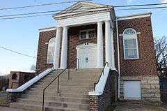 The Jones Memorial Methodist Church is a historic church building at 400 East Main Street in Hartford, Arkansas. It is a T-shaped two story brick building, with a gabled roof and stone foundation. Its main facade has a Classical Revival appearance, with a gabled portico sheltering the main entrance, supported by six large Doric columns. Built in 1921, it is the only major example of the architectural style in the small city. The $25,000 cost of its construction was a burden on the congregation, and its mortgage was paid off in the 1930s by Dr. Elisha Baxter Jones, in whose honor the church was thereafter named.[2]