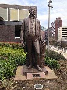 Brotherton died suddenly from a heart attack aged 73 in January 1857, while travelling to a meeting in Manchester.[1] He was buried on 14 January in the new Weaste municipal cemetery, Salford, the first interment at the cemetery he campaigned for, following a two and a half mile long funeral procession.[1] A Joseph Brotherton Memorial Fund was established, and a statue of Brotherton was erected in Peel Park in 1858.[1] The statue was dismantled in 1954 and sold into private ownership in 1969. At the time Salford City Council were looking for any additional revenue and it sold the statue to a scrap metal merchant. He was aware of the rivalry between the two cities so he approached Manchester with the suggestion they might buy it. It was purchased by Manchester City Council in 1986, and was resited at Riverside Walk, overlooking the River Irwell and facing towards Salford. The effect was that he was looking balefully at the city that thought so little of him as to sell his statue. It is currently being relocated onto the Salford bank of the Irwell to make way for a new footbridge linking Salford to the Spinningfield development.[2][3]