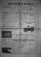 In the late 1940s Sáenz-Díez remained member of the rather inactive Carlist leadership, in 1947 nominated to the first post-war Consejo Nacional[81] and taking part in meager party initiatives, also abroad.[82] When in the early 1950s Manuel Fal commenced a project of launching a semi-official national Carlist daily, due to his business position Sáenz-Díez was entrusted with bringing it to a successful end. Since 1951 he set sights on Informaciones, an ailing Madrid commercial newspaper;[83] following some legal and financial maneuvering, in 1953 he purchased the daily.[84] Formally his private property, it was left at disposal of Comunión Tradicionalista[85] and pursued its editorial line.[86] Sáenz-Díez entered Consejo de Administración and brought new staff to the newspaper, transferring his old collaborator Goñi Aizpurúa from El Correo Gallego and attracting other professionals.[87]