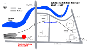The Jubilee railway line is a former railway in Adelaide, South Australia. It was built in 1887 from where the Adelaide station currently is to where the former Jubilee Exhibition Building was. The line used an existing tunnel under King William Road which was built in 1854 to transport horses and cattle.[1][2] The tunnel is likely the origin of rumours about rail tunnels located under the city of Adelaide.[3] Much of the land where the line once ran has been constructed over to build parts of Adelaide University and the Adelaide Festival Centre. There were no stations built. No known evidence of the line remains today.