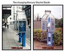 BT's telephone boxes in the UK soon saw a rival with the introduction of Mercury Communications own set of telephone booths, which were launched on 27 July 1988 with 26 booths at Waterloo Station, London.[22] The Machin-designed Mercury booth was as best accepted by the public and, at worst, possitively hated. Examples of the response included "something from outer space",[23] "pieces of fairground machinery"[24] and "demented bird tables - complete with perches."[25] but, and much more importantly to Mercury, they turned out to be non-profitable. The Mercury payphone sites closed down in 1995, with many of the sites taken over by Interphone, who went on to replace the Machin booths with their own housings.