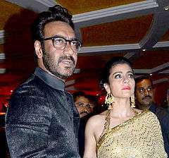 Kajol began dating fellow actor, Ajay Devgn, in 1994, while filming for Gundaraj.[9] Members of the media, however, labelled them as an "unlikely pair" due to their contrasting personalities.[92] Devgn explained their relationship by saying, "We never resorted to the usual 'I Love you' routine. A proposal never happened. We grew with each other. Marriage was never discussed, but it was always imminent".[93] They subsequently got married on 24 February 1999 in a traditional Maharashtrian style ceremony at the Devgan house.[94] The wedding was subject to wide media scrutiny, as certain members of the media criticised Kajol's decision to settle down at the "peak of her career".[95] Kajol, however, maintained that she would not quit films, but would cut down on the amount of work that she did.[54][96]