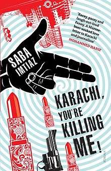 Karachi, You're Killing Me! is a 2014 comedy crime-thriller novel by the Pakistani journalist-writer Saba Imtiaz. The author's debut novel was released in paperback by India's Random House on 1 February 2014.[1] It is written about a 20-year-old reporter, Ayesha Khan, living in one of the world's most dangerous cities, Karachi, about her misadventures and finding a nice lover. The novel received mostly positive feedback from the reviewers. Imtiaz describes the novel as "Bridget Jones's Diary" meets "The Diary of a Social Butterfly."[2] In 2015, the novel was optioned by producer Vikram Malhotra for a Bollywood film adaptation.[2]