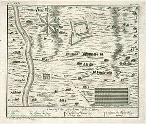 The fort was located on the slope of a hill, with 5 m (16 ft) high ramparts, a single gateway and a 4 m (13 ft) walkway on top. It was diagonal in shape, with two bastions, which each accommodated six cannon,[3] as a result it was often described as a redoubt rather than a fort.