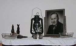 Most members of Kemetic Orthodoxy, as part of their devotional practices, set up household shrines to the deities they worship. The basic necessities of such a shrine include an incense burner or diffuser, a lamp or candle, and a place to put offerings.[15] Shrines may contain representations of certain deities, or they may have a more general focus. They often contain objects which have been offered to a deity or deities. The individual uses this shrine to perform various rituals including the Senut daily rite.[15] Individuals may honor deities to whom they are particularly called, as well as deities in festival, deities associated with the time of year, or even deities of whom they have a special request.