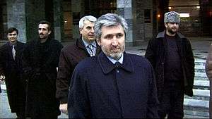 After April 2001, he became actively involved in work of Eurasia Party led by Russian nationalist Aleksandr Dugin, despite being officially wanted by police.[3] On June 28, 2001, he appeared on the Dugin party's press conference in Moscow to propose that Chechnya be divided into North Chechnya (the plains region within the frame of the Russian Federation) and South Chechnya (the mountain region largely independent from Russia, but still closedly bonded to Russia and fiercily hostile to "Wahhabism", that is Islamic fundamentalism).