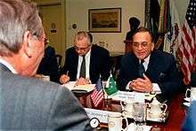 Khurshid Mahmud Kasuri (Urdu: خورشيد محمود قصورى; b. 18 June 1941), is a Pakistani politician and writer who served as the Minister of Foreign Affairs of Pakistan between November 2002 until November 2007.[1][2]