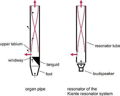 The diagram shows the sound generation processes in an organ pipe and in the resonator of the Kienle Resonator System. To activate the organ pipe, the required air flow (black arrow) must be generated first in a sufficient quantity and supplied from below through the pipe foot. The air flow is directed through the windway against the upper labium where air vortexes replace each other, alternatingly between the inside and the outside.[1] This process stimulates the air column in the tube and it starts to oscillate. An example of the distribution of the sound wave's fundamental tone created in the tube is shown in the diagram by red curves. The node is located at the height of the curve intersection, the anti-nodes occur close to the openings emitting the main part of the sound. The oscillation of the air column and the sound emittance of the Kienle Resonator System occur in the same manner as in a traditional organ pipe. However, the air column in the tube is stimulated by a small loudspeaker which is installed at the lower end of the resonator and which provides the stimulating air flow by the reciprocating movement of its diaphragm.