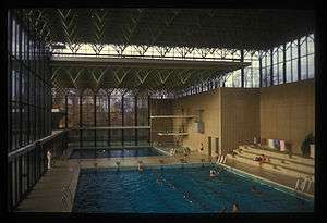 The original venue was designed by Karen and Ebbe Clemmensen and built in two phases.[1] The swimming venue was built in 1966-1969. It was followed by two halls for ball games in 1970-1972. The complex was listed in 1998.[2]